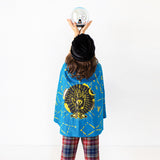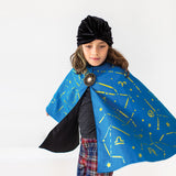 This cape is made from 100% lined Twill & Kona cotton, printed with eco friendly inks. Velcro closure. Simple flowing cut to fit ages 4 to 9ish. One Size
