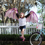 Who's going to train this Dragon? These heirloom quality wings will let your lil dragon's imagination run wild! Shimmer Pink and Purple is bold & perfect for flying all around this summer. Adjustable hook & loop neck closure & double stitched hand grips.