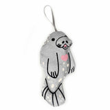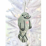 Handmade Silver Manatee Keepsake Ornament. Everyone loves a Sea Cow! Hand screen printed on natural cotton canvas, this fun creature measures approx 5.5" x 4" and will liven up any tree.
