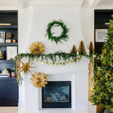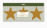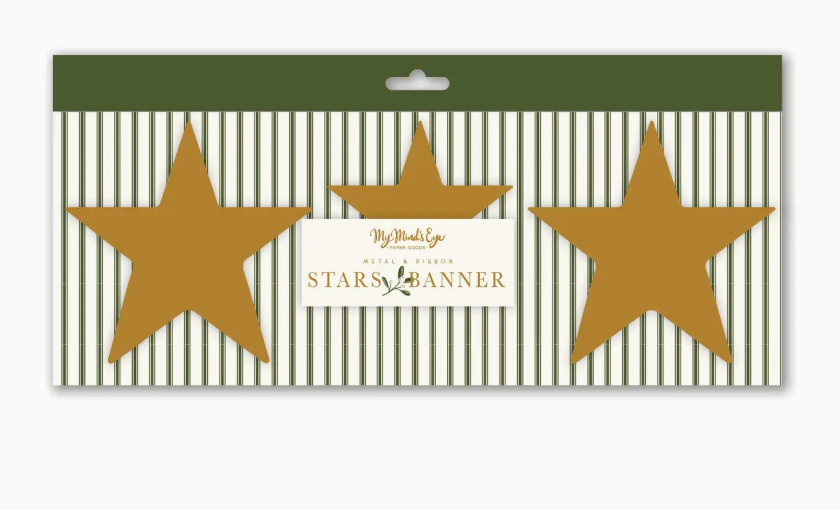 Make a starry statement this Christmas with this star banner. Perfect for everyday holiday decor, or as a festive accent piece at your holiday party, this banner features metal stars with shimmery gold that will a touch of traditional Christmas shine to your home this holiday season. • banner is approximately 5.5' long • brass metal stars are 4" and 3" tall • 17 metal stars strung on ribbon