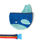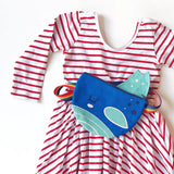 A Whale of a Good Time! Hands free and fashionable this fun keepsake fanny pack will store your favorite goodies. Measures 5"x7" with zipper closure and belt loops with colorful webbing. 100 % cotton canvas with water based inks. Comes with a 1" wide webbing belt with triglide adjustable closure. Fits up to a 30" waist.